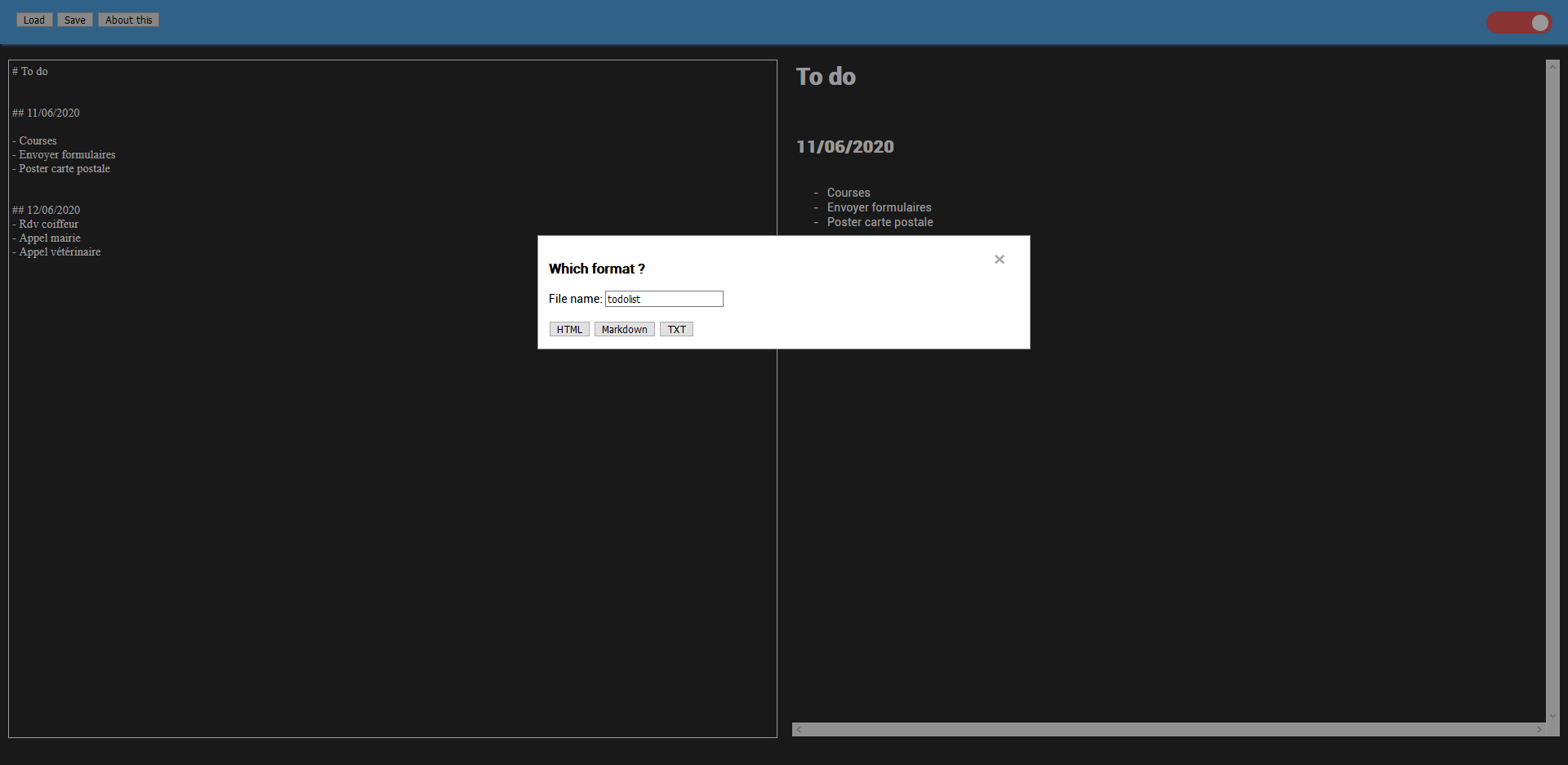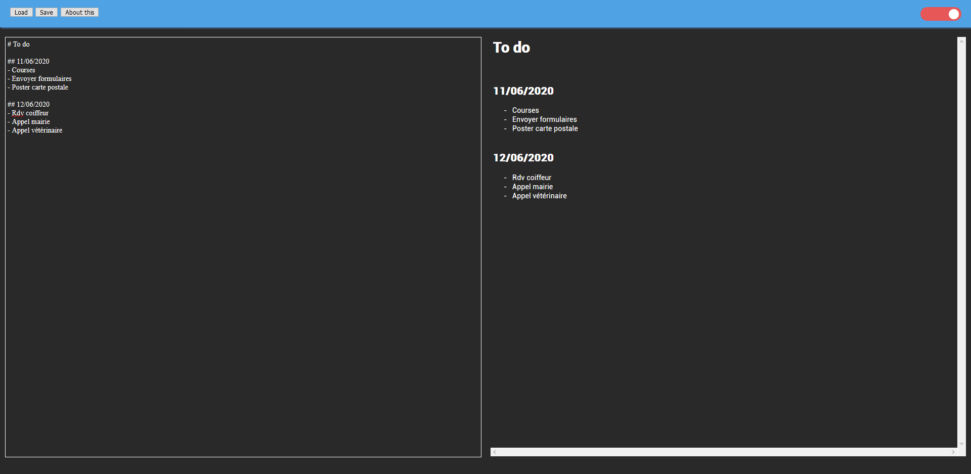 Cet éditeur WISIWYG (What You See Is What You Get) fonctionne en temps réel: le résultat s'actualise au fur et à mesure que le texte rédigé en Markdown est modifié.